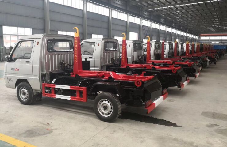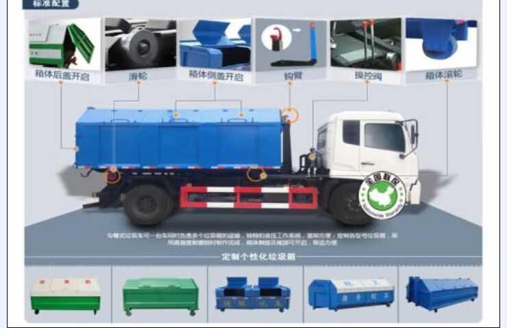 钩臂垃圾车(又称:车厢可卸式垃圾车、拉臂车),主要适用于市政环卫、物业管理、大型厂、工矿等各种场所收集、运载各种垃圾。该车具有结构合理、操作简便、倾倒方便等优点,能实现一台车与多个垃圾厢联合作业,循环运输,充分提高车辆的运输能力。