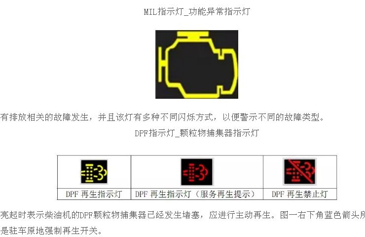 DPF 灯包含 DPF 再生指示灯和 DPF 再生禁止灯,灯的显示形式主要为黄色闪烁、常亮和红色。①DPF 再生指示灯 黄色+闪烁:驻车再生提醒,需要到安全位置进行驻车再生;图一右下角蓝色箭头所指的是驻车原地强制再生开关。②DPF 再生指示灯 黄色+常亮:表示车辆正在再生,行车或驻车再生。③DPF再生指示灯 红色+常亮:服务再生提醒,需要将车辆开往服务站进行服务再生。④DPF 再生禁止指示灯 红色+常亮:禁止再生,在加油站或者危险地方按下再生禁止开关(仪表再生禁止灯显示红色指示灯闪亮或常亮时,仪表会有相应的注释)。注:驻车原地主动强制再生时,发动机的排气温度相当地高,请司机朋友们注意避开易燃易爆等危险区域。
